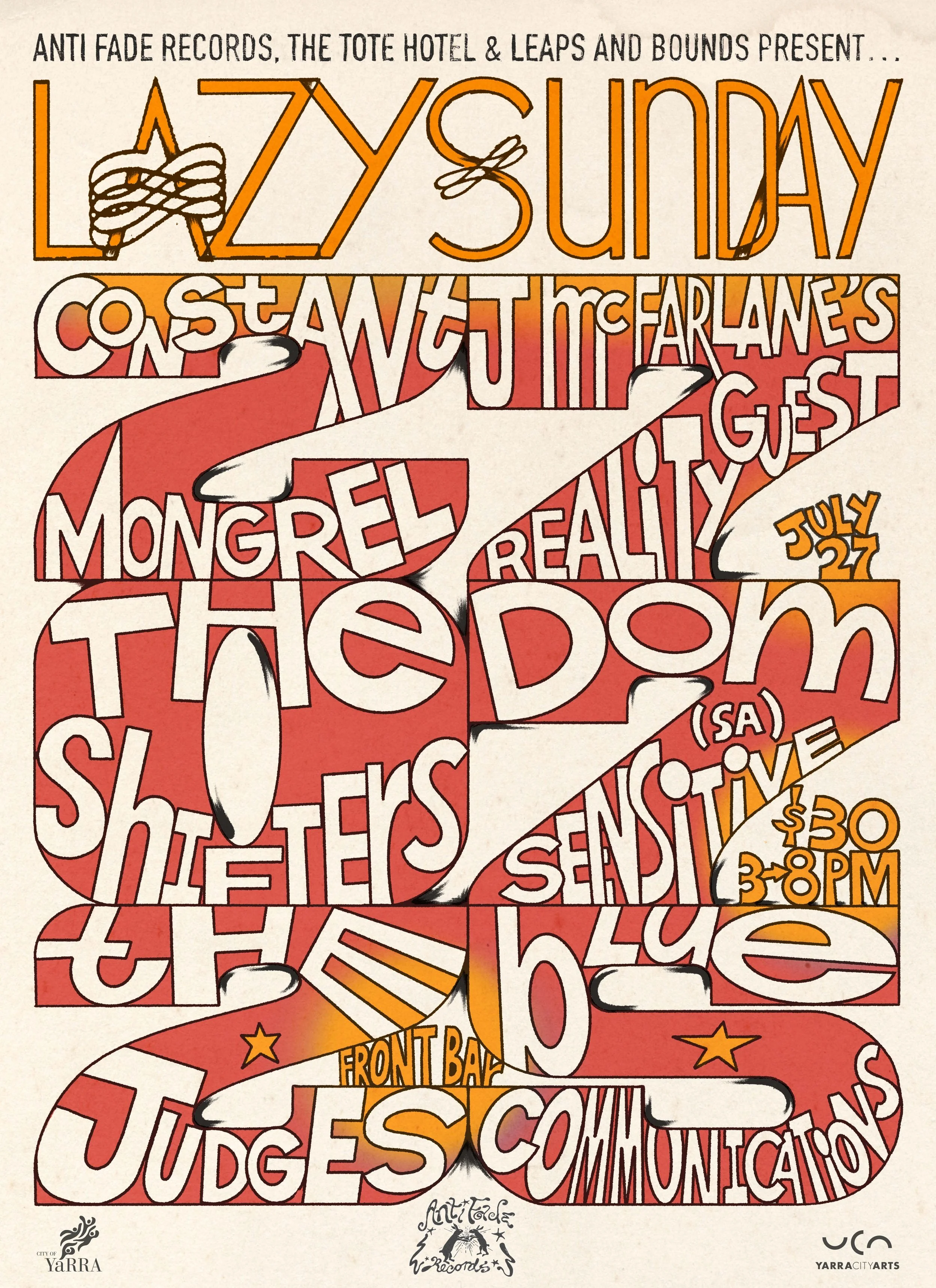 Constant Mongrel return for their first local show since 2021, joined by rare appearances from J. McFarlane’s Reality Guest, The Shifters, and Dom Sensitive (Yartapuulti/Port Adelaide) in the band room.